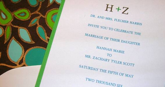 AFTER HANNAH & ZACH'S WEDDING, EVERYONE WANTED THE INVITATIONS AND THEY AGREED, SO HERE THEY ARE. THE INVITATION IS PRINTED ON BRIGHT WHITE COTTON FELT STOCK IN TEAL INK AND AFFIXED TO A BRIGHT KELLY GREEN BASE CARD, BOTH WITH HAND ROUNDED CORNERS, ENVELOPE HAND LINED WITH BATIK GILDED HANDMADE PAPER. ALL ELEMENTS ARE CUSTOMIZABLE.